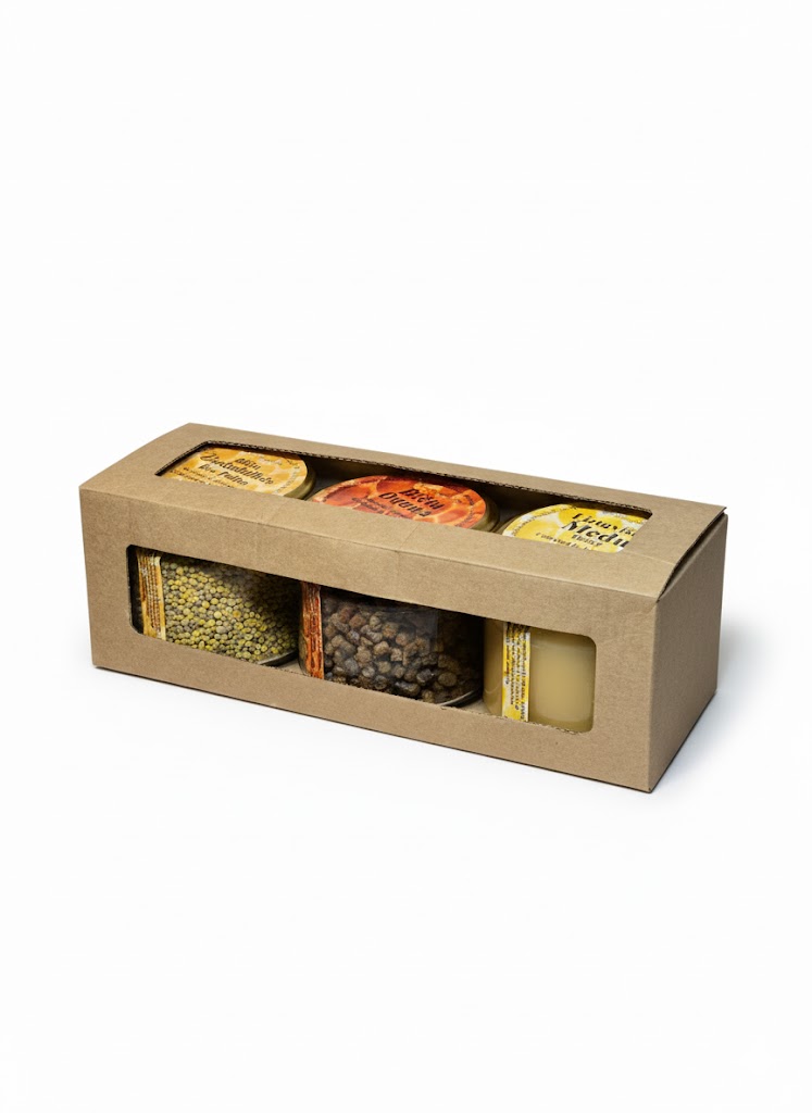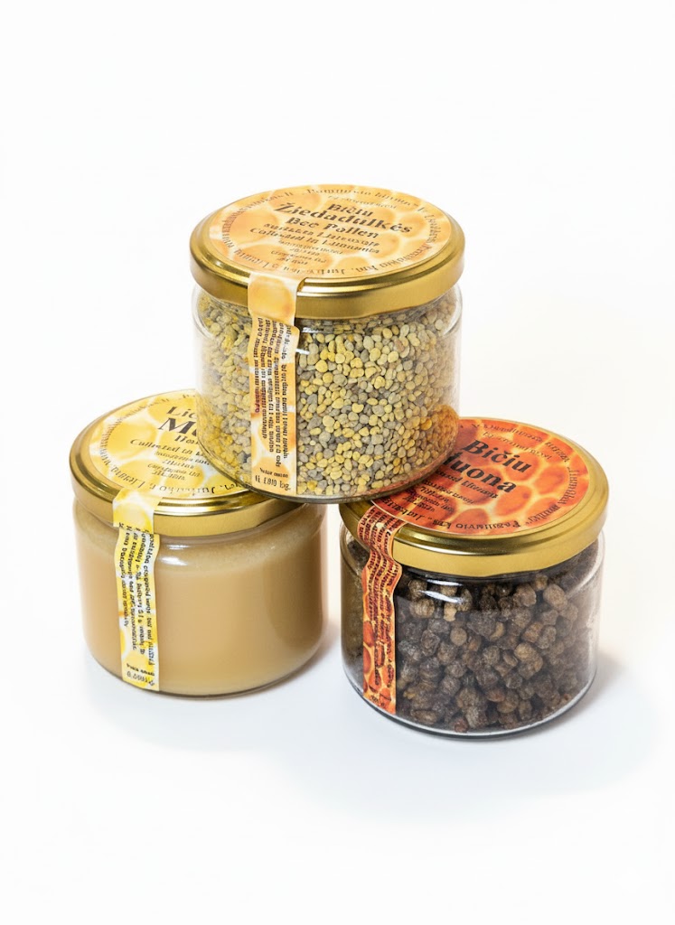 Rinkinį sudaro Žiedadulkės 180g, Bičių duonelė 180g, mažas Medaus stiklainis (400g.).